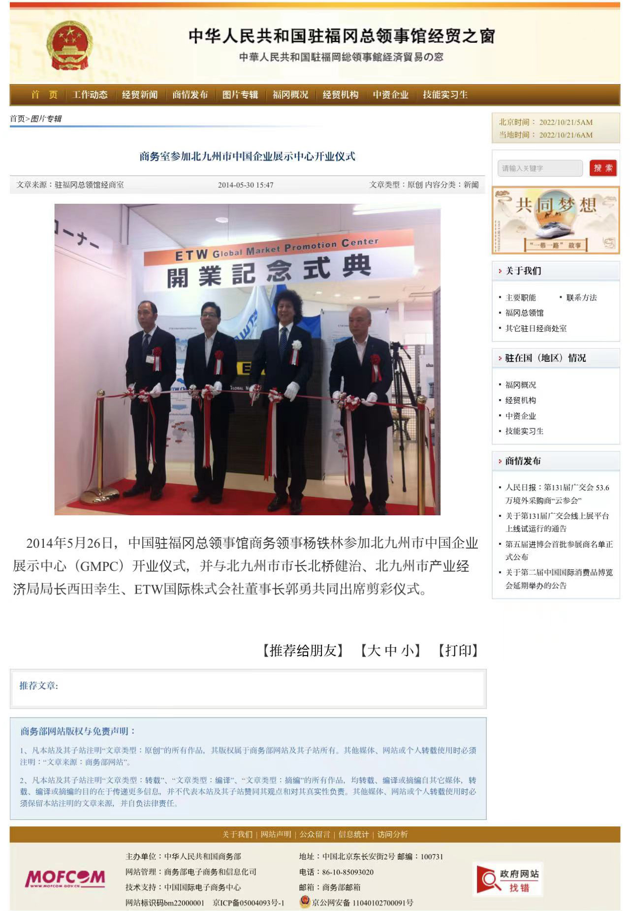 ETW創(chuàng)始人與中華人民共和國(guó)祝福岡總領(lǐng)館領(lǐng)事,以及北九州北橋市長(zhǎng),產(chǎn)業(yè)經(jīng)濟(jì)局西田局長(zhǎng),在"ETW日本展館GMPC"開(kāi)館儀式剪彩!